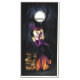 A blonde witch sitting on a large orange pumpkin. At her side is a black cat on a pile of books. In behind is a forest and castle.