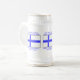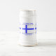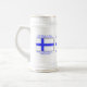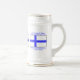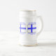 Beer stein with flag of Finland reading, THE BLOOD OF FINNS FLOWS THROUGH MY VEINS AND SOMETIMES THEIR BEER. Design shoes on three sides of mug. Fun for special guests at parties or your good self. Lovely housewarming gift for the home bar.