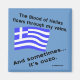 Waving Greek flag and words reading, "The blood of Hellas flows through my veins. And sometimes...its ouzo." Fun for a laugh on Oxi Day or anytime.