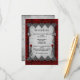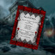 This 'Blood Roses and Silk Red Gothic Wedding' reception enclosure card is a very opulent invitation indeed, which features a lush, rippling red silk-look background, with a gray antique parchment-look paper on top. Along the top and bottom of the parchment are gray and black gothic jewels decorating the edges, with pairs of creepy little silver skulls on chains hanging off the corners. There are red roses along the side with black lace ribbon to finish off the spooky, gothic feel of this enclosure card. The reverse of the card features the gray parchment-look again, with a larger version of the blood red rose and lace. A decorative, yet practical way to let your wedding guests know all the important details of what is sure to be your fabulous gothic wedding reception!