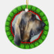 A beautiful Bloodhound decked out in a bright red and green Christmas wreath.