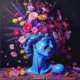 "Bloom of Eternity" – A Colourful Surreal Portrait. This piece fuses the permanence of sculpture with the fleeting vibrancy of flowers, creating a visual dialogue between stillness and growth. The serene blue figure appears timeless, yet crowned with an explosion of radiant blossoms that seem to pulse with life, symbolizing rebirth, creativity, and the enduring cycles of beauty found in both nature and art.