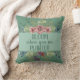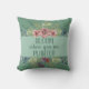 "Bloom where you are Planted" is the message on the front of this pretty inspirational pillow. The message is at the center of a light green banner that is bordered in soft pink, cream and blue flowers, with a touch of crimson and gold. The image is placed on a medium teal green background. The back of the pillow has a second floral bouquet image, without the text.