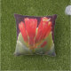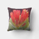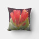 The image on this Throw Pillow is an original photograph by ZoeSPEAK of an agave plant blooming in the garden. The setting sun lights up the vermilion red petals of the soon to be open flowers, giving them a warm yellow glow against the dark background. The agave's disc-shaped leaves surround the flowers with their soft bluish green color.