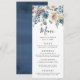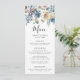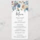Elegant custom wedding menu card featuring a top border of painted watercolor flowers in white, beige and blue accented by subtle greenery. Personalize the custom wedding menus by adding your names, wedding date, and wedding menu details.