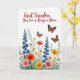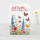 Designed with a lush garden scene filling the lower half of a bright white background, the card shows tall deep-indigo flower spikes rising behind layers of green leaves and mixed blooms. Clusters of white and sunny yellow daisy-like flowers dot the greenery, while coral, orange, and soft rose-pink blossoms spill across the front like a shared bouquet between loved ones ❤️. Near the top, three winged insects with orange-and-black markings drift in gentle arcs, adding a light, affectionate sense of motion. Across the upper area, a flowing red message is centered and easy to spot, reading “Great Grandma, Your Love is Always in Bloom.” The lettering sits above the flowers with plenty of breathing room, letting the garden feel like it’s growing up toward the words. Soft, watercolor-like shading gives the petals and leaves a tender look, as if the scene is leaning in close like a warm hug 👩. The orange-and-black insects hover just below the red text, with their wings angled as if caught mid-flutter.