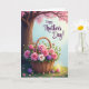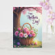 Designed with a cozy spring scene, this card features a rustic woven basket overflowing with layered pink roses, small white flowers with golden centers, and clustered deep purple blooms tucked into rich green leaves ❤️. The arrangement sits on fresh green grass, and scattered pink petals nearby feel like they were just shaken loose, adding a gentle, affectionate touch to the setting. A tall tree branch frames the upper left, dotted with matching pink blossoms that lean inward as if watching over the bouquet. Soft, diffused light washes the background, shifting from pale sky blue above to a warm golden glow near the horizon. To the right on the grass, a single pink candle glows quietly, creating an intimate corner of light 🌼. Across the upper portion, the message appears in flowing lettering, set in a dark tone that stands out against the airy sky. The basket’s woven texture is detailed with warm brown strands, and the candle’s flame reflects as a faint highlight on the grass.