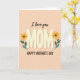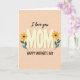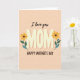 This card features a loving Mother’s Day design centered on the big word “MOM” in large creamy-yellow letters with soft shading that gives them gentle depth. Above it, the words “I love you” sit in a flowing, cursive-style line in a darker tone, like a quiet note whispered close ❤️. On both sides of “MOM,” two sunny yellow flowers with deep brown centers lean inward, as if they’re keeping the message company. Each bloom stands on a slender green stem with layered leaves in deep green and cool teal, adding a fresh contrast to the warm colors. Below the main word, “HAPPY MOTHER’S DAY” appears in a rounded, easy-to-read font in a darker color, neatly centered under the larger letters. The overall layout feels friendly and close, with the flowers framing the text like a gentle hug 🌼. The background is a soft peach color with faint, organic blob-like shapes scattered lightly behind everything.
