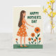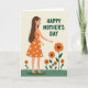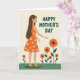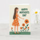 Designed with a gentle, celebratory look, the illustration centers on a graceful woman shown in side profile, her posture calm and affectionate as if sharing a quiet moment with nature ❤️. She wears a sleeveless orange dress patterned with small white blossoms, and her long dark hair flows down her back in soft waves. Around her, large stylized flowers in deep orange with dark brown centers rise on green stems, echoing the dress pattern and adding a cozy, friendly warmth to the scene. A band of bright green grass fills the lower foreground, giving the composition a grounded, garden-like setting. The pale cream background keeps everything airy and open, letting the warm colors feel like a sunny day. A short message appears in dark green lettering near the top, standing out clearly against the light backdrop without crowding the figure. Her right hand reaches toward the nearest bloom, the gesture reading like a tender touch or a shared secret between friends 🌼. The flowers cluster beside her at mid-height, with the tallest blossoms leaning slightly toward her shoulder against the cream backdrop.