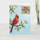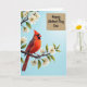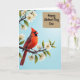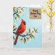 This card shows a bright red crested bird perched on a sturdy, twisted branch in the lower left, its feathers detailed and soft-looking as it turns its head to the right with a calm, affectionate gaze ❤️. Small white five-petaled blossoms cluster along the branch, each flower dotted with dark centers that add contrast and texture. Behind everything, a pale blue sky fades gently from lighter to slightly deeper tones, giving the scene a fresh spring-day setting. In the upper right, a rustic-looking rectangular panel sits like a sign, adding balance to the open sky. A short message is placed on that panel in flowing, cursive-style lettering, shown in a dark ink that stands out against the textured background. The bird’s dark face markings frame its eye, and the way it looks outward feels like a quiet moment shared with someone close 🌼. White blossoms trace the branch from left toward the middle, while the text panel remains anchored in the top-right corner against the blue gradient.