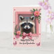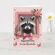 Designed with a centered portrait of a small masked woodland animal, the card draws you in with dark, attentive eyes that feel like a quiet, affectionate glance ❤️. Its brown-and-black fur is detailed and softly lit, set inside a pale pink rectangular frame that keeps the focus close and intimate. Around the frame, layered paper-cut flowers in fuchsia, peach, and light pink mingle with green leaves that spill outward as if reaching toward someone. The background stays a gentle pastel pink, giving the whole scene a tender, friendly warmth without overpowering the details. At the bottom of the frame sits a satin-like pink bow with a slight sheen, adding a touch of dressy charm like a gift shared between loved ones. Small pink butterflies and tiny scattered blossoms float across the space, creating a light, fluttering motion like a soft hello 🌼. A message appears beneath the artwork in flowing dark pink lettering, centered and easy to spot against the pale background. The bow’s loops catch the light with subtle highlights, and the tails rest just below the frame’s lower edge.