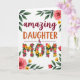 This greeting card features a white background with a floral theme that highlights the close bond between a daughter and her mom ❤️. The main text sits centered, with the word “amazing” placed above in deep red, flowing lettering that feels like a warm, affectionate note. Directly beneath it, “DAUGHTER” appears in rich orange, using simple, sturdy lettering that gives it a confident, supportive tone. The word “&” is tucked neatly between the lines, keeping the layout balanced and easy to read. Below that, “MOM” becomes the focal point, with each letter shaped from clustered flowers and leafy stems, like a gentle garden grown into words 🌼. Pink rose-like blooms, sunny yellow petals, and small purple accents mingle in the letters, suggesting tenderness through their soft, layered shapes. A leafy border with mixed blossoms frames the design, with fuller pink flowers gathered at the corners and smaller red and yellow flowers dotted along the edges.