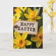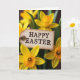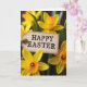 This card shows a parchment-toned tag centered among spring flowers, creating a cozy scene that feels like a small gift shared between close friends 🌷. The tag has softly browned edges for an aged look, and a loop of coarse twine at the top makes it seem freshly tied to a bouquet. Around it, bright yellow trumpet-shaped blooms open toward the viewer, their deeper orange-gold centers ruffled and textured like tiny frills. A few flowers are sharply detailed while others fade into a gentle blur, as if you’re leaning in close while someone stands beside you, shoulder to shoulder 🐇. The lighting is soft and glowing, casting mild shadows that pick up the veins in the petals and the grain of the tag. The words “HAPPY EASTER” sit in the middle of the tag in dark, easy-to-read lettering, standing out against the warm tan background. Rich green leaves fill the edges of the scene, with yellow blossoms clustering in the foreground and background around the twine-tied tag.