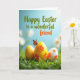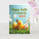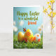 This design shows three decorated eggs resting close together in thick green grass, with a softly blurred background of pale blue and white blossoms that feels like an early spring morning 🌷. A bright yellow egg sits low in the frame, covered with small orange, daisy-like flowers that mirror the gentle, affectionate tone of the scene. Balanced nearby are a second yellow egg and a smooth white egg, each trimmed with similar sunny floral accents, as if they were arranged side by side like close friends. A butterfly pauses on the front yellow egg, its patterned wings adding a quiet, tender moment of closeness to the arrangement 🐇. Across the top, the greeting “Happy Easter to a wonderful friend” is placed in a loose, handwritten-style font. “Happy Easter” appears in green, while “to a wonderful friend” is set in orange to match the flower details. Soft, diffused light brightens the eggs and picks up the texture of the grass blades around them. Behind everything, the sky-like backdrop fades into a gentle wash of light blue with small white blooms.