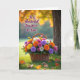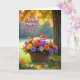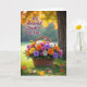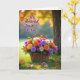 Designed with a rustic woven basket overflowing with multi-petaled flowers, this card front feels like a gentle hug in a garden ❤️. Sunny yellow, warm orange, deep purple, bright pink, and soft white blooms crowd together in a close, friendly cluster, like they’ve leaned in for a shared photo. The basket sits on a rich green lawn, where a few amber and russet leaves are scattered nearby, adding a cozy seasonal touch. A soft golden glow washes over the scene, and the background fades into a blurred canopy of coppery foliage that frames the bouquet like a tender backdrop. On the right side, a sturdy tree trunk stands in muted brown tones, grounding the airy light and giving the setting a calm, steady feel. In the upper left area, the message “To a Wonderful Daughter-In-Law!” appears in flowing dark lettering that contrasts clearly against the warm, hazy background 🌼. The flowers show crisp detail in the foreground while the distant leaves dissolve into gentle gold and copper shapes behind them.