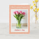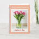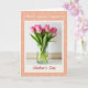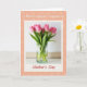 This design shows a fresh bouquet of rosy pink tulips gathered closely in a clear, cylindrical glass vase, their closed buds leaning toward one another like close friends ❤️. Tall green stems rise from visible water, set against a softly lit off-white background that feels like a calm indoor corner. A cream-colored frame surrounds the floral scene, giving it the look of a classic instant photo tucked into a keepsake. Beyond that frame, the larger background is warm peachy-orange with a repeating pattern of small outline blossoms that quietly echo the tulips. Near the top, a short line of text sits centered in a dark, refined serif-style font, spaced neatly above the framed “photo.” Near the bottom, a larger phrase is centered in deep crimson, standing out strongly against the peach field, with a tiny 🌼 detail nearby. The vase remains transparent enough to see the waterline and the submerged green stalks inside.