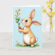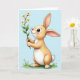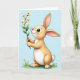 This design shows a sweet long-eared bunny standing upright against a calm sky-blue background, drawn with rounded shapes and gentle shading 🐰. Its tawny fur and white belly catch a soft glow, and its big dark eyes tip upward as if searching for someone special. In its paws, the bunny holds a thin branch of small white blossoms with sunny yellow centers, like a shy offering on a spring day 🌷. A faint blush on its cheeks and a small, bashful smile suggest a tender, friendly moment captured mid-gaze. The bunny sits slightly to the right, leaving open space where the flower branch reaches up and guides your eye toward the light on its face. Near the bottom, a narrow strip of green grass is sprinkled with tiny matching flowers, adding a quiet garden setting. The greeting text sits near the top in soft pastel lettering, with a smaller line placed lower down in a lighter shade.