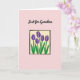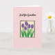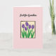 This card features five stylized flowers in rich purple with green stems and leaves, arranged closely like a small bouquet shared between loved ones ❤️. A slightly uneven black square frame surrounds the flowers, giving the center a relaxed, intimate look rather than a rigid one. The framed bouquet sits on a pale cream panel that feels soft and calm, set against a wide blush-pink background. Near the top of the cream panel, the words “Just for Grandma” appear in flowing black lettering, centered above the flowers. Each petal has a thin white inner line that adds a gentle highlight, like a tender glow on the blossoms. The flowers are spaced in a balanced but natural way, suggesting quiet closeness and care 🌼. The blush-pink field around the cream panel keeps the focus on the framed bouquet and the black text. The black frame line looks slightly irregular at the corners, as if drawn with a steady hand and left intentionally imperfect.