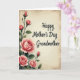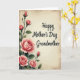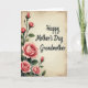 Designed with a classic floral look, this card features a vertical garland of blush-pink roses and deep green leaves running down the left side. The flowers move from tight buds to fully open blooms, and the soft shading makes the petals look gently luminous, like they’re leaning toward someone with quiet affection ❤️. On the right half, the message “Happy Mother’s Day Grandmother” is placed in large, flowing lettering, creating a calm balance against the flowers. The text appears in a dark ink tone that stands out clearly without feeling harsh, and it sits centered on the open space to the right. Behind everything is a lightly aged paper background with warm sepia tones, giving the scene a cozy, nostalgic feel 🌼. The edges look softly worn and slightly mottled, as if the card has been kept in a drawer of treasured notes. Fine details show in the rose petals’ curled layers and in the slender stems threading through the greenery.