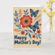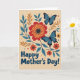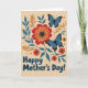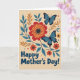 Designed with a large red flower at the center, the illustration shows petals fanning out from a golden-yellow middle with a darker dotted core. Two winged insects hover nearby with teal wings outlined in black, their white edge-dots making them look like they’re drifting together in a gentle, friendly dance ❤️. Around them, slim branches carry cool teal leaves, mixed with small sprays of warm ochre foliage that fill the space without feeling crowded. Tiny red and yellow blooms and little starburst shapes are scattered across a creamy beige background, adding light pops of color like quiet compliments between friends 🌼. Along the lower edge, the message “Happy Mother’s Day!” sits in rounded dark blue letters, easy to spot without overpowering the artwork. The lines are crisp and the colors are laid down in smooth, solid areas, giving the scene a modern folk-art feel. Warm reds and yellows stand out against the cooler teals and deep blue accents, and a few starbursts sit near the upper corners on the beige field.
