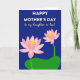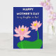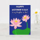 This card features a deep blue background that makes the message and flowers stand out with a calm, affectionate feel ❤️. Near the top center, “HAPPY MOTHER’S DAY” appears in large white letters that are easy to read and feel celebratory. Just below, “to my daughter-in-law!” is written in smaller white lettering with a flowing look, adding a gentle, close-knit tone like a warm note shared between family. At the bottom, two stylized flowers bring in a soft, romantic touch, like a quiet bouquet offered with a tender smile 🌼. The larger bloom sits on the lower left in pale pink with layered petals that suggest depth without heavy detail. A smaller matching flower rises on the lower right, connected by a green stem that curves toward the center. Each flower has a bright yellow center, and a single green leaf extends from the stem on the right side.