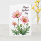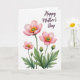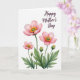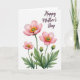 Designed with a soft botanical arrangement on a white background, this card features a cluster of flowers filling the lower two-thirds of the tall layout, like a gentle bouquet offered with care ❤️. Three open blossoms show wavy pink petals that fade from deeper blush near the center to pale, almost see-through edges, giving them a tender, just-picked look. At each flower’s heart, bright golden stamens circle a light green center, adding a warm contrast that feels like a sweet, close moment between friends. Beneath the open blooms, several green buds sit snug in their sepals with tiny hints of yellow showing through, suggesting something quietly growing. Deeply lobed leaves in layered greens spread along the bottom, their fine veins adding texture like soft brushstrokes. In the upper right, a short Mother’s Day message is placed in flowing deep magenta lettering, balanced against the open white space, with a small 🌼 accent nearby. Slender curved stems rise through the arrangement and guide the eye upward toward the text, while the petals keep a watercolor-like, translucent finish. The background stays bright white, making the pink petals, green leaves, and magenta text stand out clearly in a simple vertical composition.