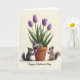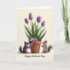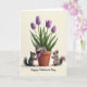 This design shows a spring scene with a terracotta flowerpot filled with five purple blossoms and thick green leaves, set against a creamy white background. Three small bushy-tailed animals with soft gray-brown fur gather around the pot, their bright eyes turned toward one another with an affectionate, friendly curiosity ❤️. One peeks from inside the foliage, resting its paws on the rim as if leaning in to listen. On the left, another stands upright and offers a small smooth purple orb in its paws, like a shy little gift meant for a close companion. On the right, the third animal holds a matching purple orb, watching the exchange as though sharing in the secret. Near the top, a short greeting sits centered in purple lettering, with a smaller line of text beneath it in a lighter shade. Soft light falls from above, adding gentle shadows on the pot and highlighting the velvety texture of the closed petals 🌼.