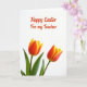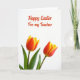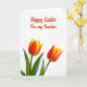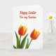 This design shows two large spring flowers filling the lower part of the card, their petals opening in a smooth gradient from deep orange-red near the center to soft yellow at the edges 🌷. Slender green leaves and stems sit beneath them, adding a natural base against a bright white background that keeps everything airy and light. The flowers lean slightly toward each other, like close friends sharing a quiet moment, which adds a gentle romantic touch without needing extra elements. Above the blooms, a seasonal greeting with a short dedication appears in a flowing handwritten-style font, set in cheerful red. The text is centered in the upper half, leaving plenty of white space so the message feels open and easy to read. Soft, even lighting reduces harsh shadows and makes the petal edges and color transitions look smooth and fresh 🐇. The red lettering stands out crisply against the white field, while the blossoms anchor the scene at the bottom with warm orange-red centers and pale yellow tips.