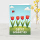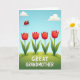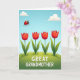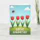 Designed with a sunny spring scene, the card features four red, blossom-like flowers lined up across the middle, their petals curving gently as if leaning toward each other like close friends ❤️. They rise from a rolling green hill shaded with soft gradients of emerald and lime, giving the ground a tender, cozy feel. Above, the sky fades from pale blue near the horizon to a deeper blue at the top, setting a calm backdrop for the scene. Rounded cloud shapes drift across the upper area, keeping the atmosphere light and airy. In the upper left, a small red-and-black spotted winged insect hovers with tiny antennae, adding a sweet touch of motion 🌼. Across the lower half, large white lettering spells out “GREAT GRANDMOTHER,” standing out clearly against the green hill. The flowers have deep green stems and sit evenly spaced, while the insect floats near the left edge beneath a cloud.