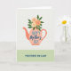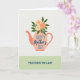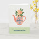 Designed with a coral teapot turned into a vase, the illustration shows a bouquet spilling from the opening, as if it’s being offered with a gentle, affectionate gesture ❤️. The flowers mix soft peach, creamy yellow, and deeper orange blooms with detailed centers, nestled among dark green leaves that curve around the arrangement like a protective embrace. A light grey-and-white gingham pattern sits across the upper background, adding a cozy, homey setting behind the main image. On the teapot body, friendly blue lettering appears in a flowing handwritten style, placed centrally so it feels like a note written just for her. The lower third is anchored by a wide sage-green band that cools the palette and gives the design a calm, grounded base. Inside that band, uppercase blue text is set in a clear line, standing out crisply against the green and reading like a direct dedication 🌼. The bouquet’s stems and leaves overlap the teapot rim, with small highlights and shadows giving the coral shape extra depth. The checkered background fades softly near the top edge while the sage band forms a straight horizontal boundary across the bottom.