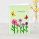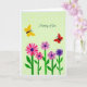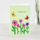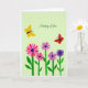 Designed with a stylized garden scene, the card shows a row of multi-petaled flowers in rich fuchsia, lavender, and deep purple rising from slim green stems and simple leaves along the bottom. The rounded blooms with darker centers create a gentle rhythm, like a bouquet offered with quiet affection ❤️. Above the flowers, two small winged insects drift close together—one golden yellow and one bright red—suggesting a sweet, companionable moment as they hover in the open space. The background is a soft, pale green sprinkled with small white dots that add light texture without crowding the scene. The words “Thinking of You” sit centered in the upper half in white, flowing lettering that stands out clearly against the green. The flat, graphic shapes and strong color contrasts keep everything easy to read while still feeling tender and friendly 🌼. White dots float across the pale green background behind the yellow and red insects.