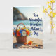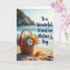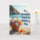 This card shows a woven basket sitting on sunlit sand, overflowing with orange, blue, yellow, and white flowers tucked among fresh green leaves. The basket’s textured weave contrasts with the soft ripples of the beach, and a few loose petals nearby feel like a gentle, caring gesture left behind ❤️. Warm light, like early morning or late afternoon, stretches faint shadows across the sand and gives the scene a calm, affectionate glow. In the distance, the ocean lies wide and shimmering, with small waves rolling in as if keeping quiet company. Hazy cliffs rise along the horizon under a clear blue sky, adding a peaceful backdrop that frames the flowers like a shared moment between close friends 🌼. The message “To a Wonderful Friend on Mother’s Day” appears over the scene in deep blue lettering, placed prominently near the upper portion of the design. Scattered orange petals and a couple of tiny blossoms rest on the sand beside the basket.