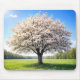 A blooming apple tree in the center of a green meadow under a clear blue sky during springtime
