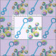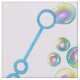 Design features an original marker illustration of a blue bubble wand blowing pretty rainbow-colored iridescent soap bubbles, on a purple background.