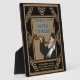 For the significant people in your life, give this very special remembrance during this year's "Days of Awe": A glossy, stand-alone plaque featuring an original digital painting by artist, Leslie Sigal Javorek, that portrays an Art Deco inspired faux picture frame in black and gold, rendering of a Rabbi blowing the Shofar that has a 3-d illusion, transliteration of the Hebrew traditional greeting, PLUS 3 customizable lines of text. (limitation of 20 characters per line).