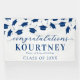 Modern graduation party banner featuring a simple white background that can be changed to any color, falling blue mortarboard caps, and a congratulations text template that is easy to personalize.