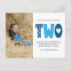 Modern, simple and elegant boy second birthday thank you postcard. Design featuring blue and navy typography two , thank you message and a photo.