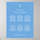 Blue 6 Table Christening Seating Chart Poster, please personalize the name of the person being christened and the names of the guests along with any of the other text that you may wish to personalize. A stylish seating chart poster featuring a white cross and elegant white text on a lovely gentle blue background.