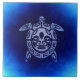 A sea turtle with an African tribal mask swims over a blue backdrop.