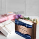 A faux copper looking background with navy blue agate, marble stone. Personalize and add your text. The name is written with a modern hand lettered style script.