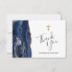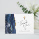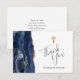 This elegant modern First Communion thank you card features a blue watercolor agate border trimmed with faux gold glitter. A small gold faux foil cross appears over the words "Thank You" in charcoal gray handwriting script on a white background. The customizable text includes your child's name on the front and an editable message on the back in italics.