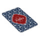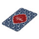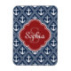 A nautical navy blue and white anchor pattern within a diamond shape background. On top of the background pattern is a red stylish quatrefoil shape label frame featuring customizable name and monogram templates.