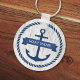 Keychain for your boat keys featuring a dark blue nautical anchor surrounded by a rope border on a light gray driftwood background. Across the anchor is a blue ribbon with a template field for your boat's name. Dark blue back.
