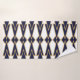 This towel set has a white washcloth, a gold hand towel, and a bath towel with an art deco design of triangles and diamonds that look like bowties in blue and gold.