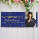 A festive graduation party banner with gold confetti on blue background. Personalize with the young graduate name,photo,school/college name and year.
