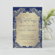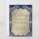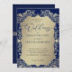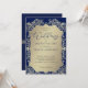 This wedding invitation pairs a rich blue background with intricate gold damask detailing for a look of timeless luxury. The ornate golden frame surrounds a soft golden panel, bringing focus to the couple’s names and event details in an elegant balance of tradition and refinement. The contrast of deep blue with luminous gold creates a regal and sophisticated style, perfect for weddings, anniversaries, and formal celebrations.