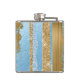 Glitzy drinking flask, with graphics of a vertical stripe design done in gold and blue, paint and glitter look. Graphics of a gold glittery edged plaque, on the front of the flask, has a blue single letter monogram ready to personalize.