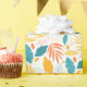 Blue, orange and gold leaf pattern on white.