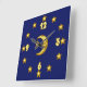 This is such a pretty and whimsical clock! Its background is deep midnight blue, and in the center is an illustration of the moon, with a star hanging from it. The numbers are accentuated with matching stars. Hang it in the library, den, children's room, or office. This clock would make a unique housewarming gift. Available in two sizes of round clock, or a square clock. Copyright Scarebaby Design.