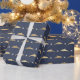 Blue and gold nautical pattern gift wrap featuring dolphins in a lattice pattern.